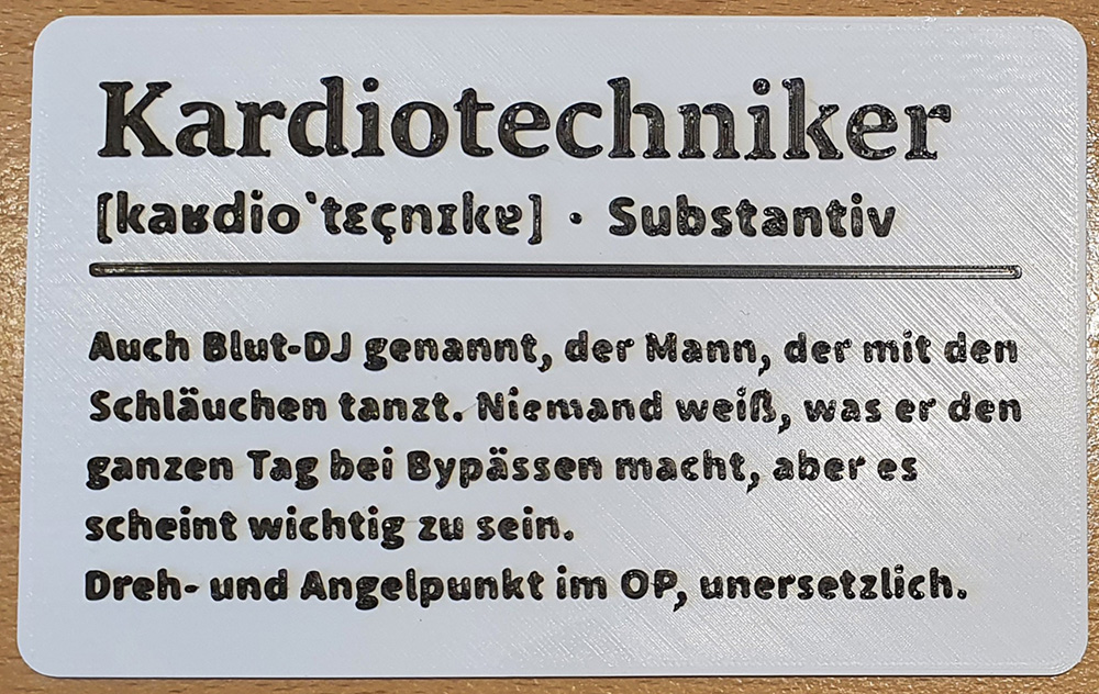 Schild "Kardiotechnik, denn auch Herzchirurgen brauchen Helden!"